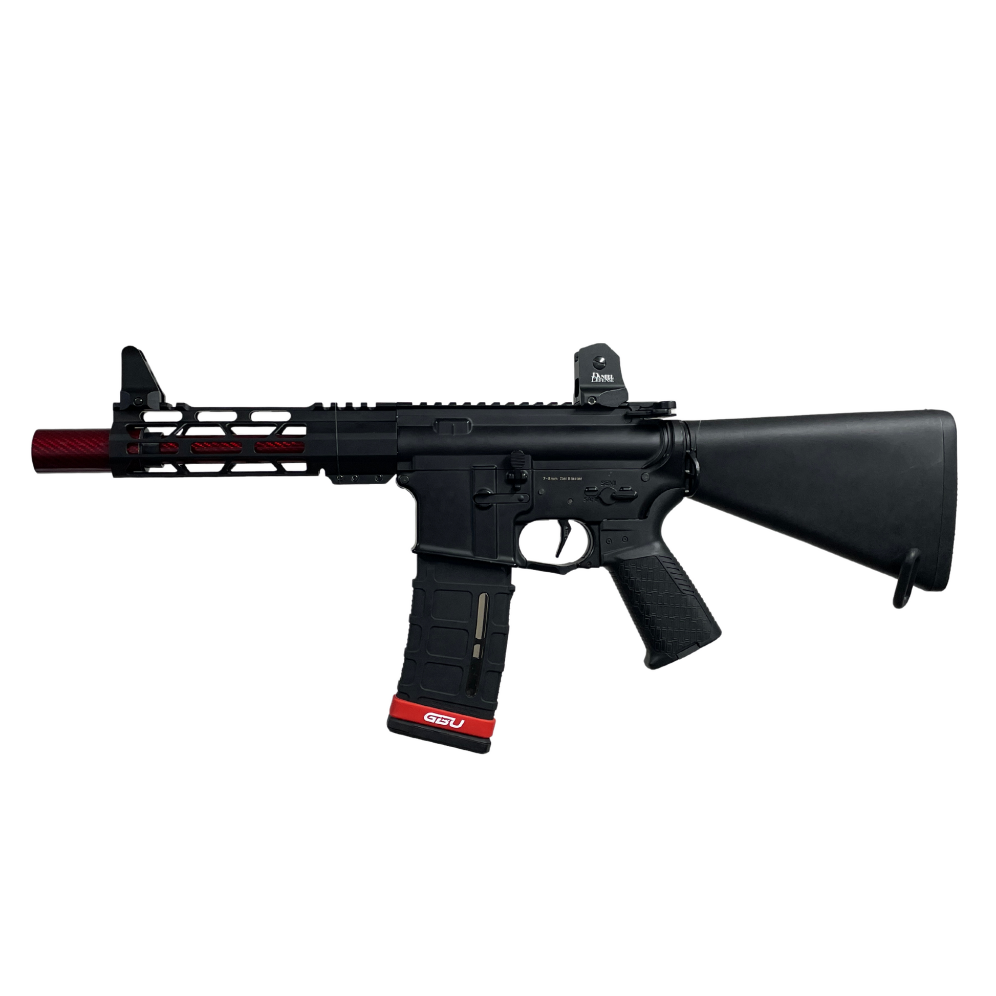 Eine weitere coole Funktion Mit diesem Blaster können Sie zwischen CQB- und Langstreckenfeldern kombinieren. Die Reichweite beträgt abhängig von den verwendeten Gelbällen 30–40 m und ist mit 280–290 Fuß pro Sekunde vollkommen feldzugelassen. Auch mit schönen roten Akzenten wie einem roten Kohlefaser-Außenlauf und einem roten Kohlefaser-Verstärker ist dieser Blaster absolut etwas, das Sie in Ihrer Waffenkammer haben möchten.