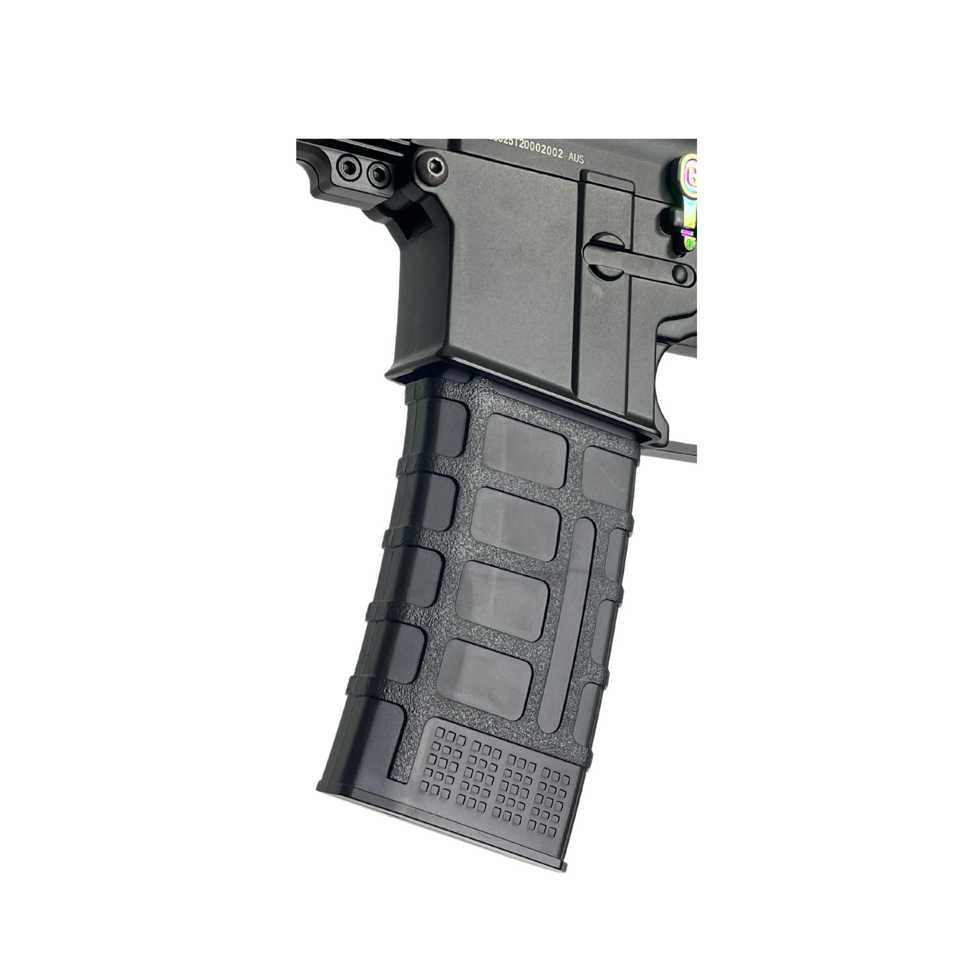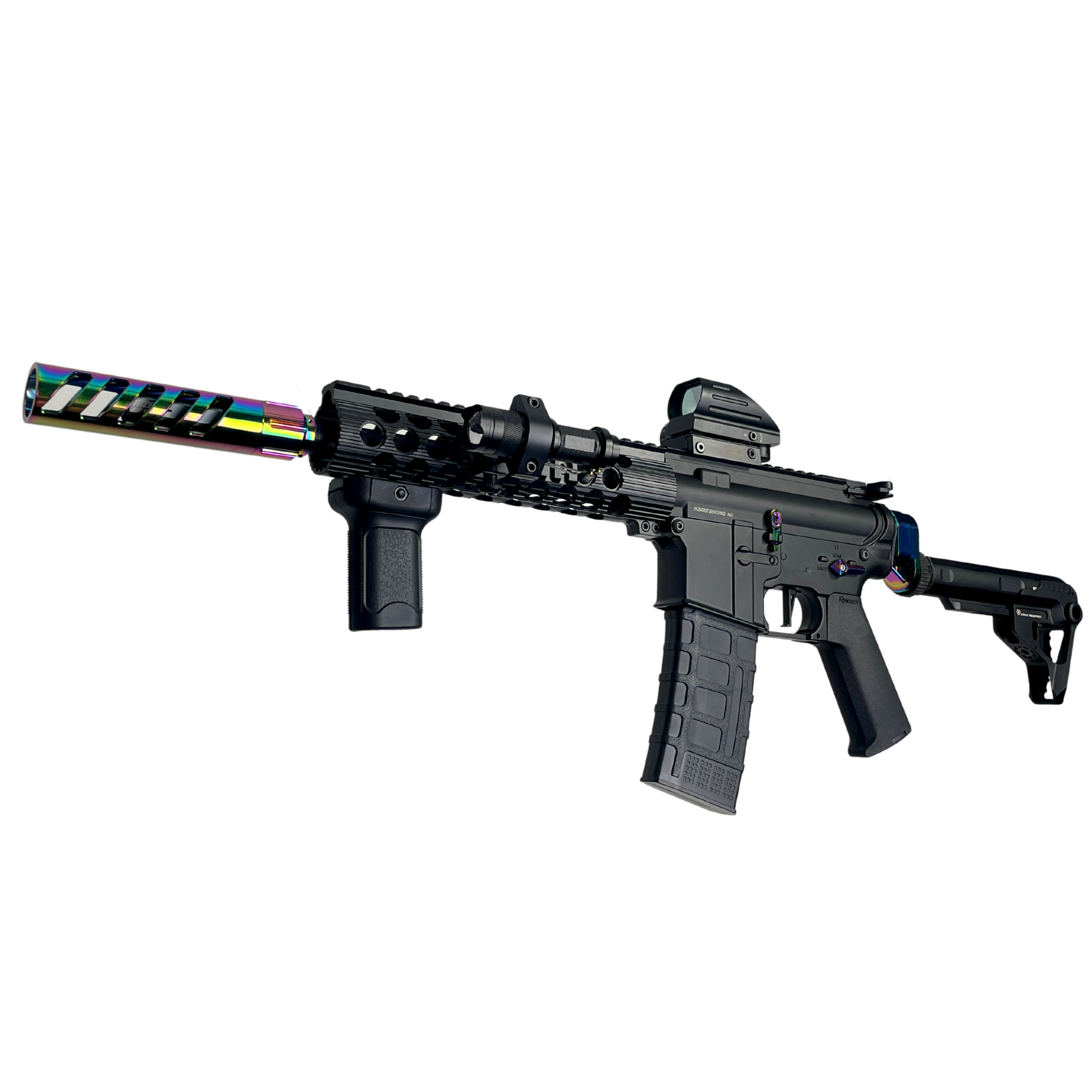 Dies ist ein voll wettkampftauglicher Blaster mit einer enormen Schusskraft von mehr als 330 Fuß pro Sekunde. Mit einem Rizer R1-Aluminium-Hop-Up aus Aluminium, das in einem speziellen GBG-Skelett-Schalldämpfer untergebracht ist, bietet dieser Aufbau die größtmögliche Präzision, die Sie in einem Gel-Blaster erreichen können.